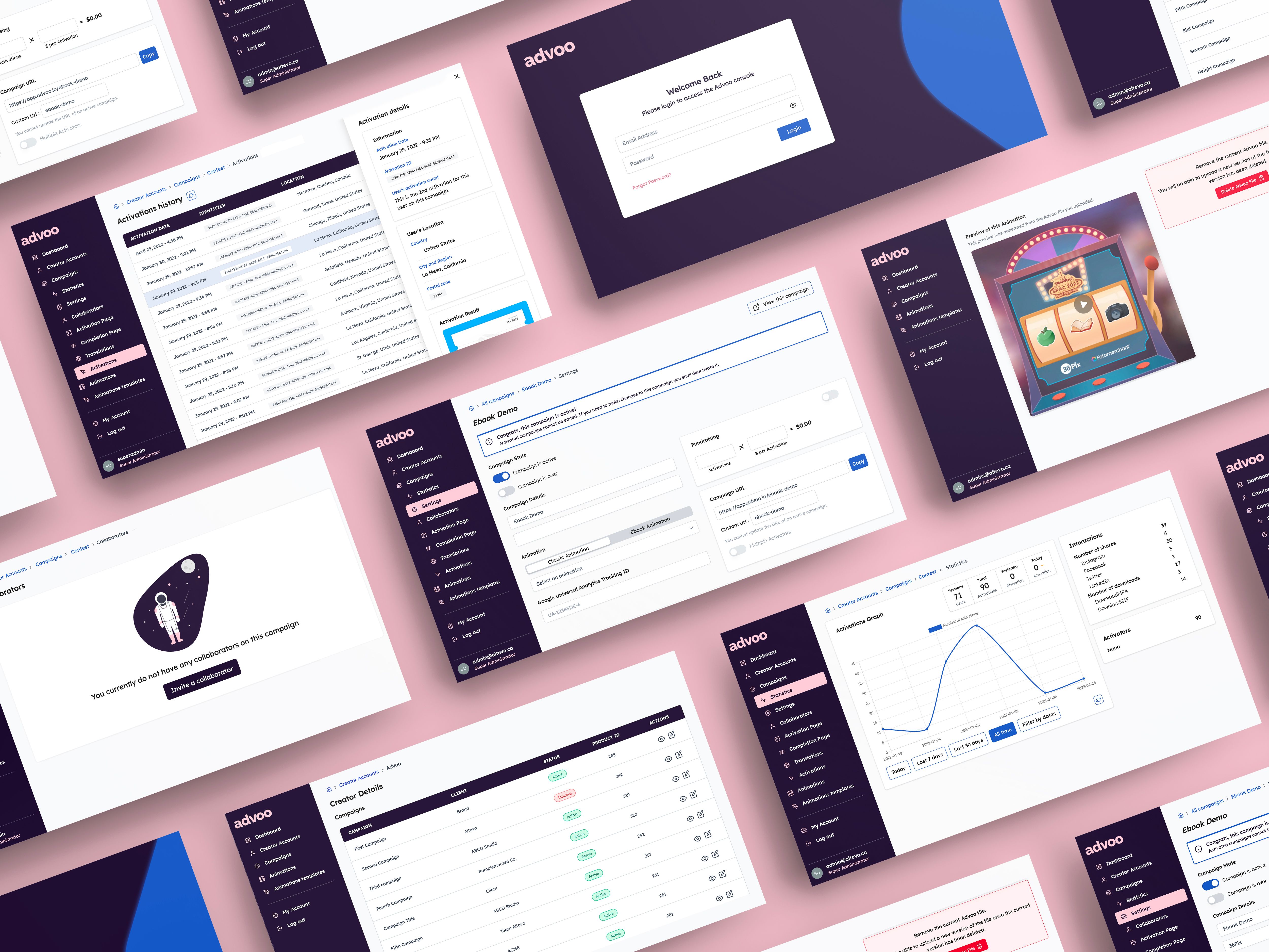 Working closely with Gabriel Grenier and the team at 36Pix, we designed and developed Advoo from the ground. Leveraging the capabilities of 36Pix's technology, the platform allows organizations to create and upload After Effects video ad templates into which faces can be embedded. These templates integrate into fully customizable campaign pages, offering choices in colors, logos, text, and images. Within these pages, the audience is invited to upload their own photo, thus creating a unique rendition of the advertisement that they can download and share. Interactions on campaign pages and shared results generate comprehensive statistics, providing valuable metrics for assessing engagement and campaign efficacy.