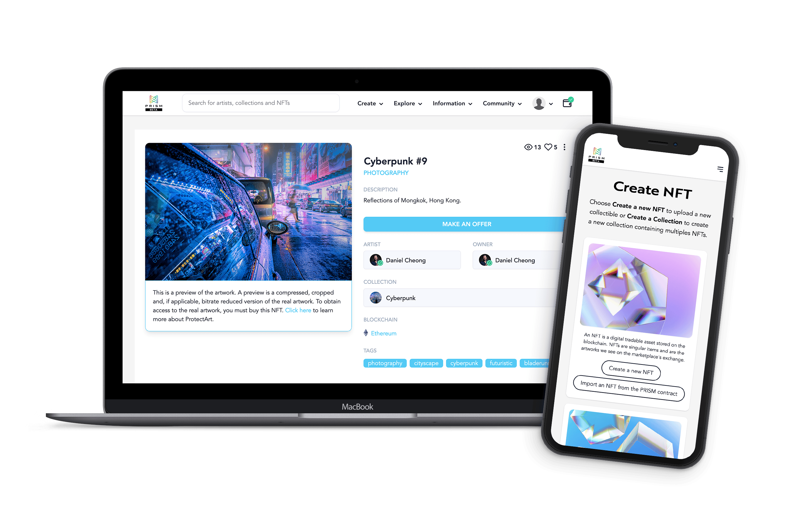 PRISM offre une multitude de fonctionnalités techniques que l'on ne retrouve pas sur les plateformes concurrentes, spécialement ProtectArt™ une technologie exclusive qui permet de protéger l'intégrité des œuvres des créateurs et de vérifier facilement l'authenticité des NFTs sur la plateforme. PRISM offre par ailleurs aux utilisateurs de nombreuses façons d'acheter des NFTs, en utilisant une variété de crypto-monnaies, dont Stellar Lumens, Bitcoin, Ethereum et Litecoin.