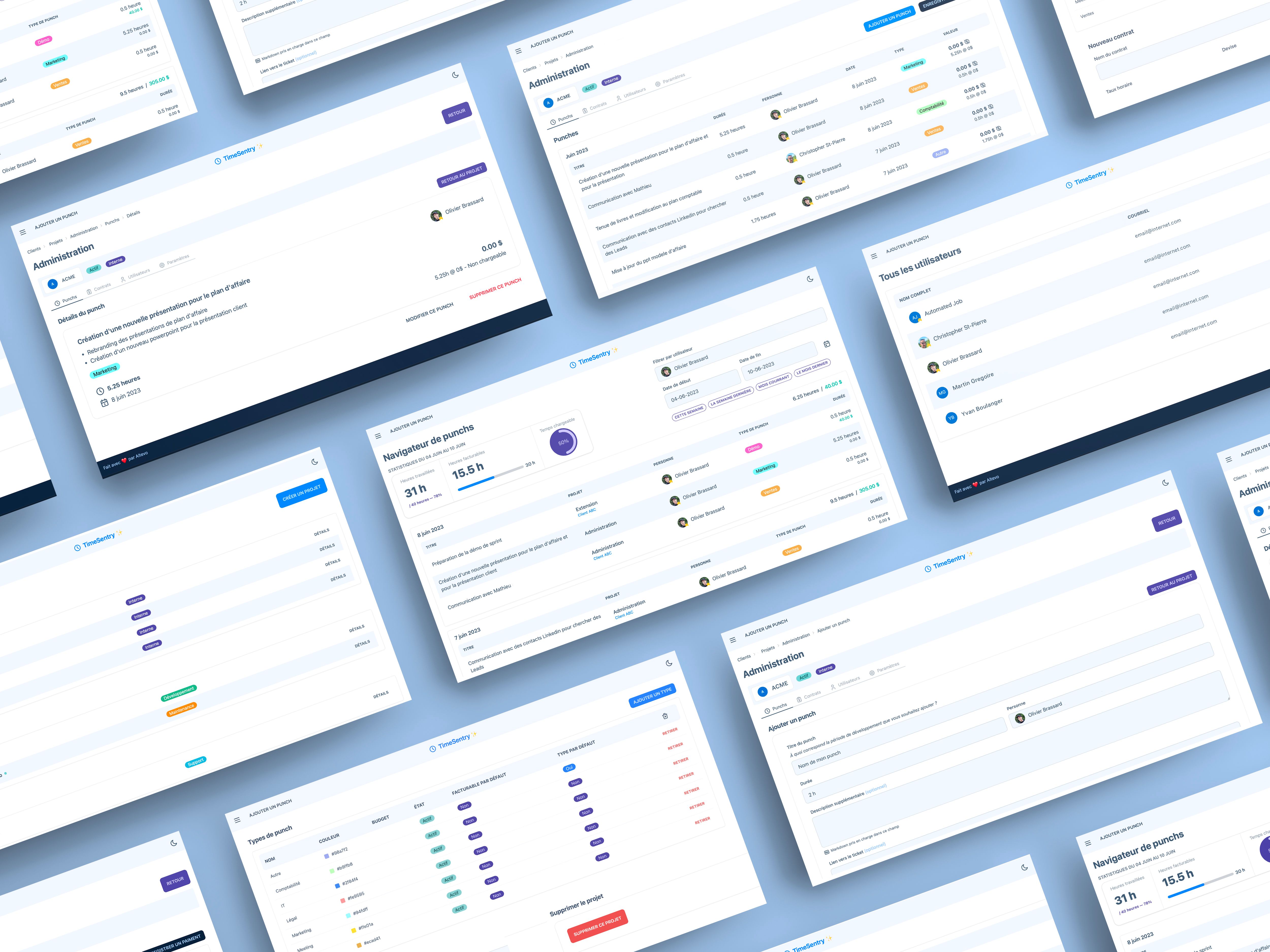 On a développé cette application pour simplifier et accélérer notre processus de gestion du temps. Il permet un suivi intuitif des activités de développement, des banques de temps, des demandes des clients et des projets. On a également optimisé les opérations redondantes comme l'envoi de factures ou de rappels de paiement.